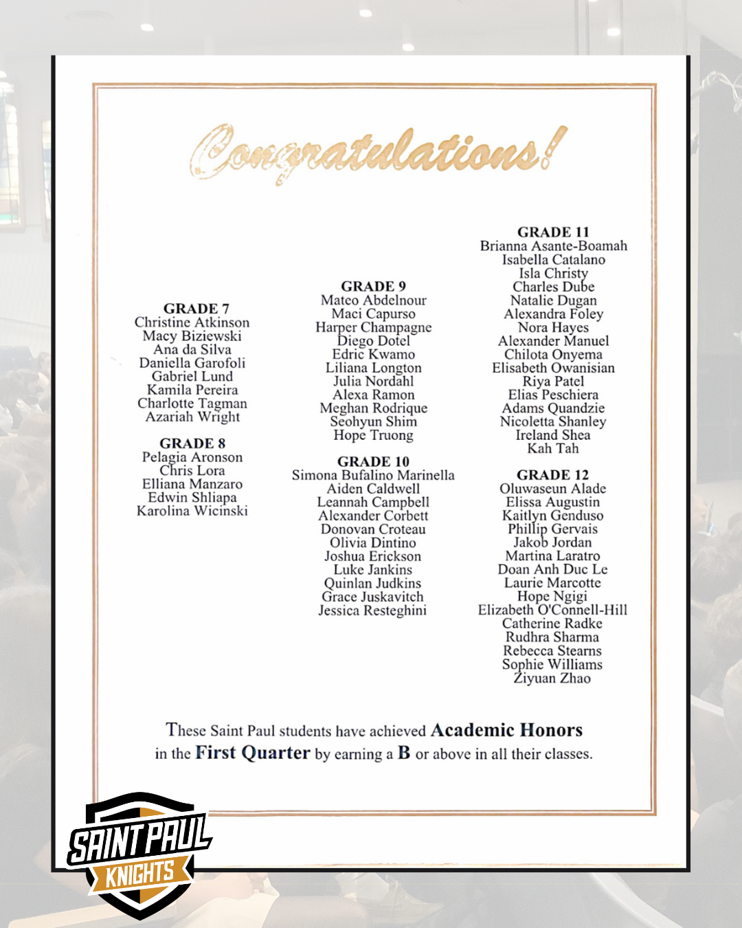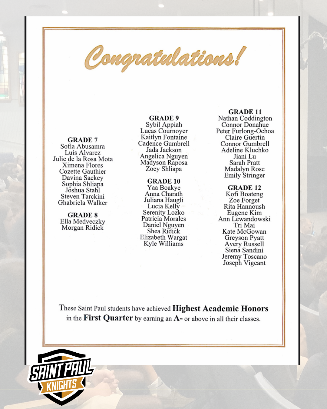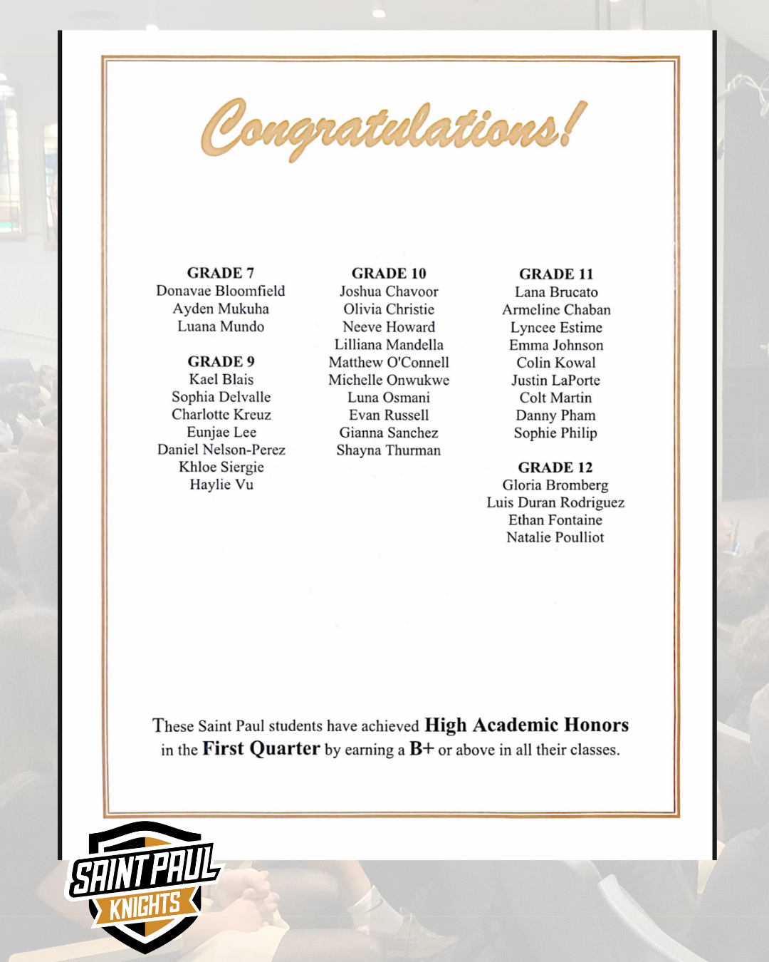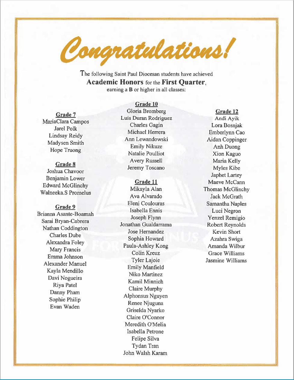 The following Saint Paul students have achieved Academic Honors, High Honors and Highest Honors for the First Quarter.